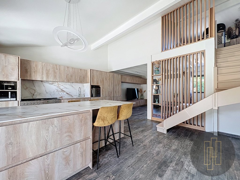 La pièce de vie d'environ 50 m² constitue le cœur de la maison. Elle accueille une cuisine parfaitement équipée, avec îlot central, ouverte sur l'espace salle à manger. Des claustras en bois structurent le salon tout en préservant la perspective et la continuité visuelle entre les différents espaces.