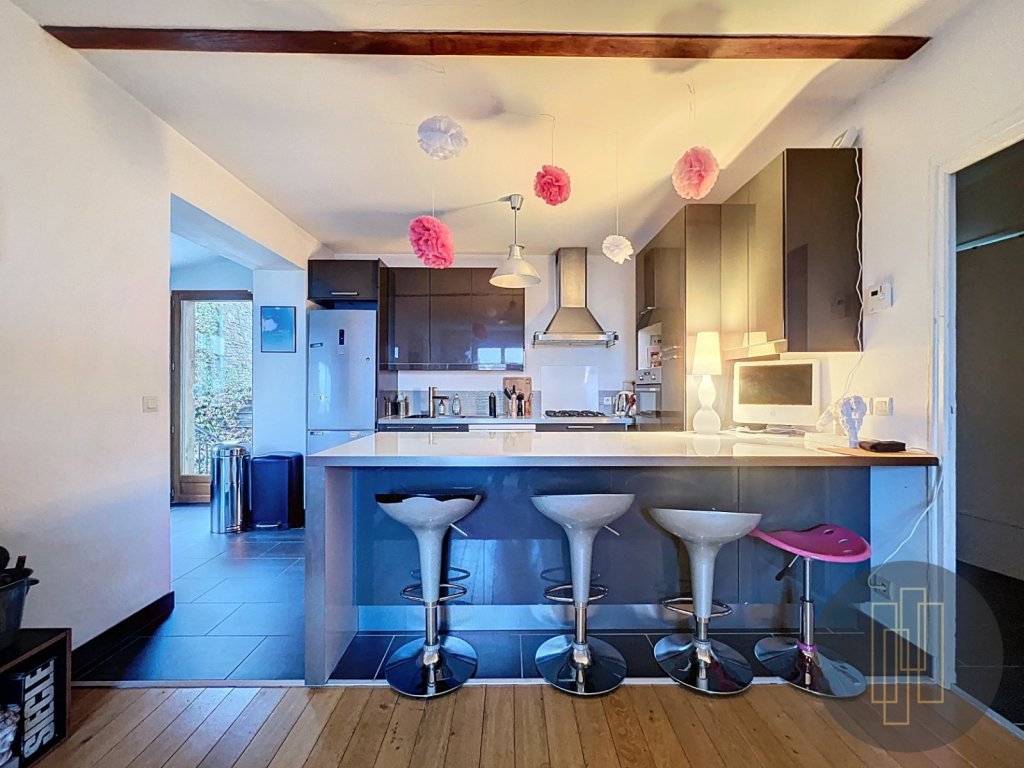 À l'étage, la pièce de vie lumineuse séduit par son ambiance chaleureuse, avec un séjour convivial et une cuisine ouverte. L'espace nuit comprend deux chambres supplémentaires, une salle de bains ainsi que des toilettes indépendantes.