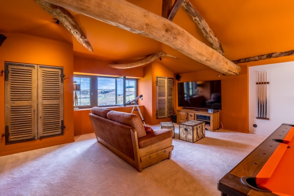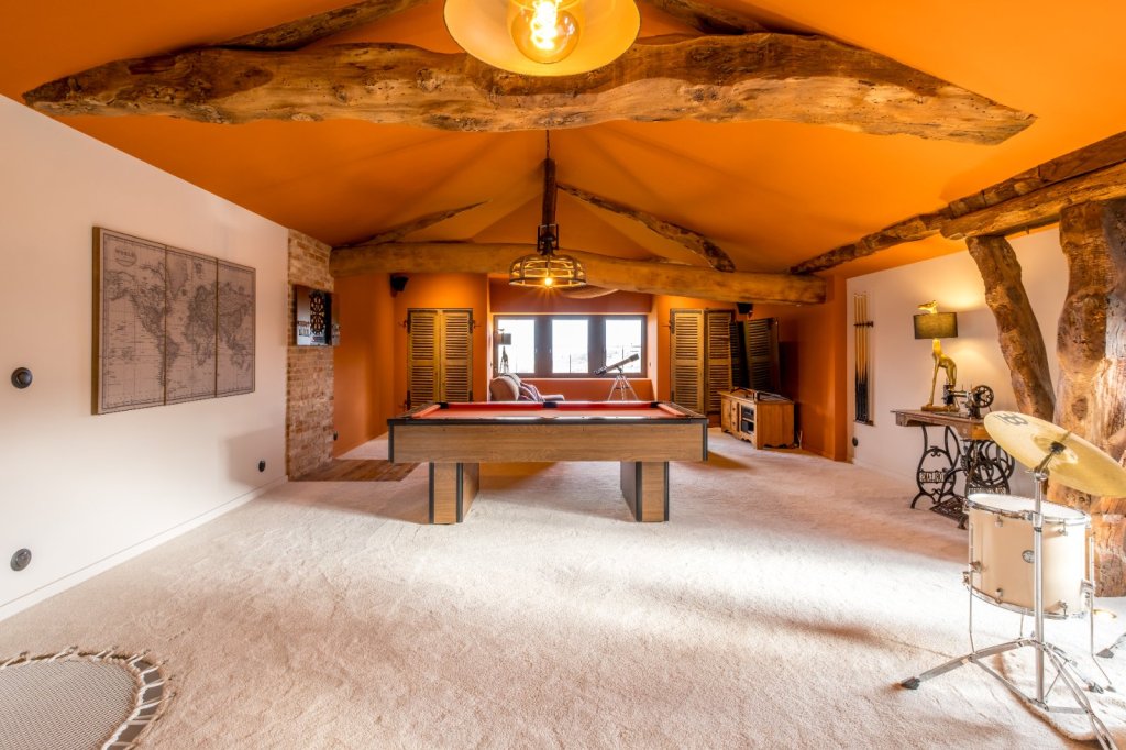 À l'étage, l'espace nuit se compose d'une chambre parentale avec salle d'eau privative (24,3 m²), trois chambres supplémentaires, une seconde salle d'eau et une très grande salle de jeux de 56,5 m², offrant de multiples possibilités d'aménagement selon vos besoins (espace loisirs, home cinéma, atelier ou pièces supplémentaires). Le chauffage individuel est assuré par pompe à chaleur avec plancher chauffant une dépendance,