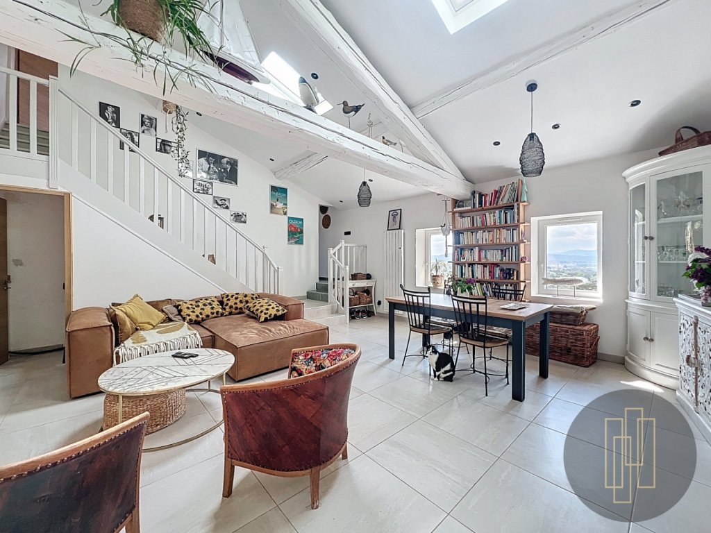 Elle s'organise autour de différents volumes, dont un séjour cathédral lumineux, prolongé par une terrasse couverte. La cuisine indépendante s''ouvre également sur une terrasse avec une superbe vue dégagée .