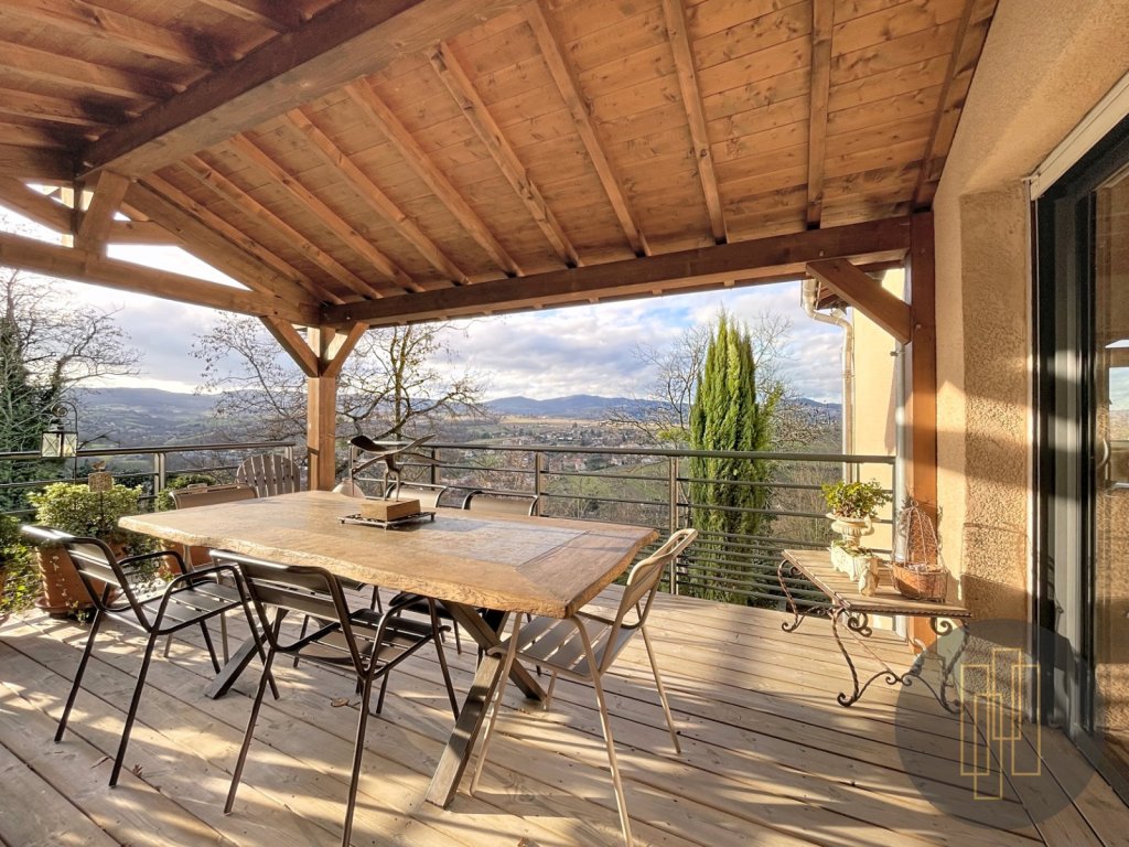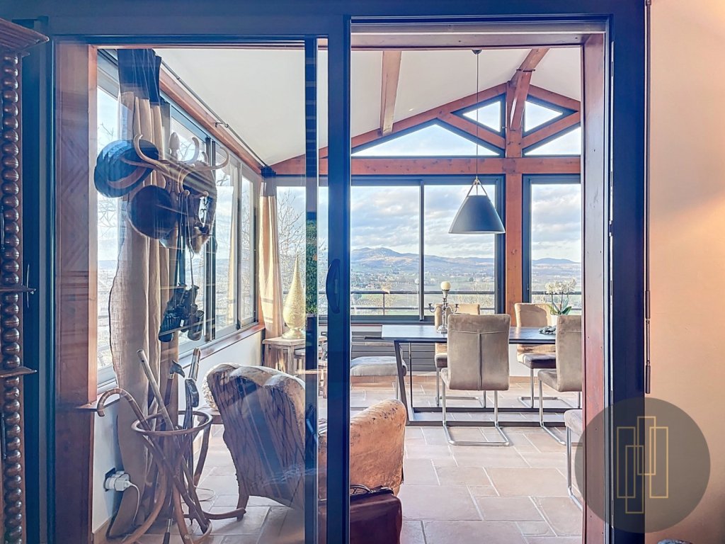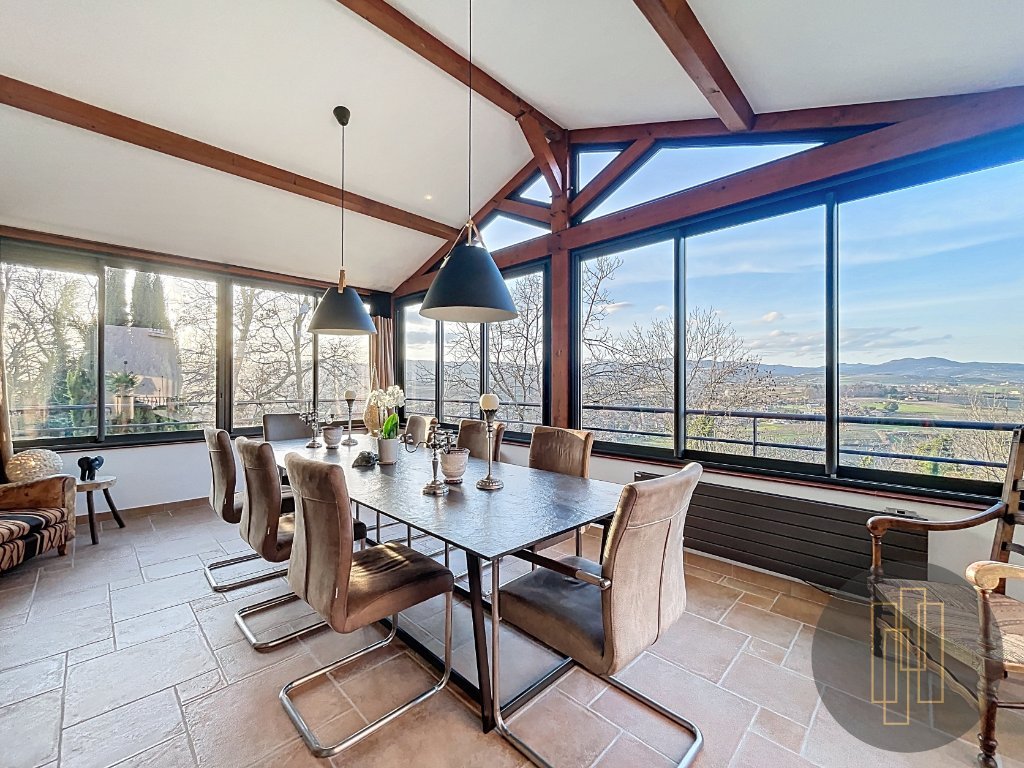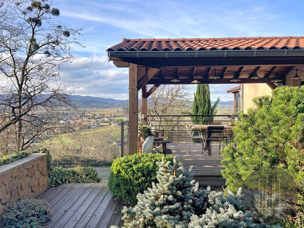 À l'extérieur, le terrain paysagé avec sa vue panoramique sur le beaujolais des pierres dorées offre un spectacle changeant au fil des saisons.