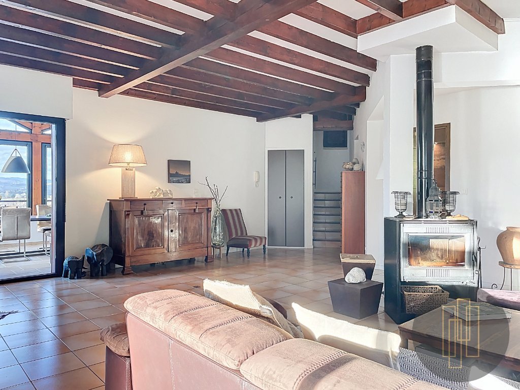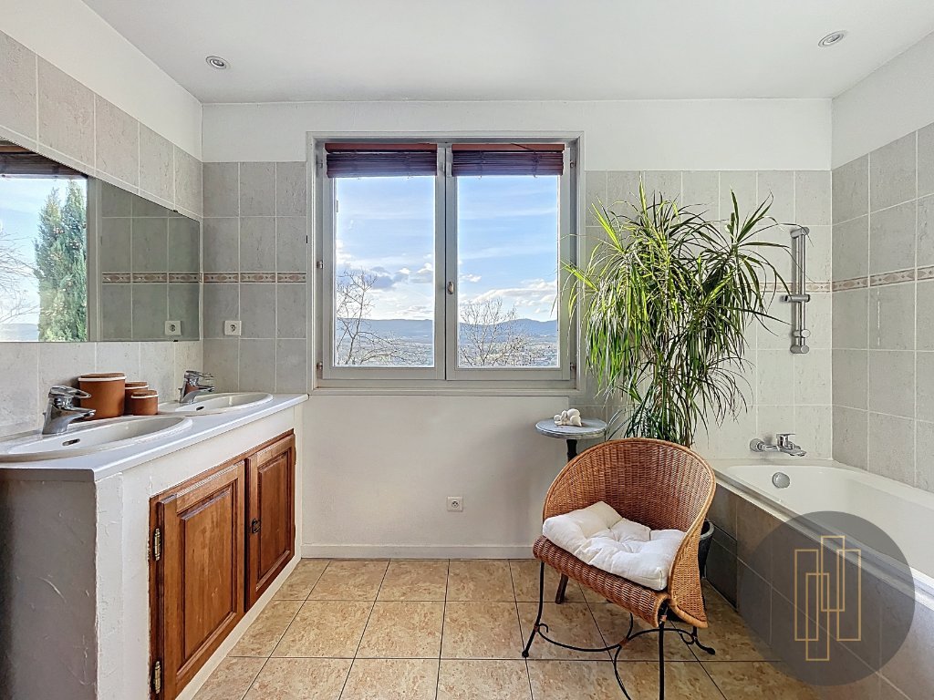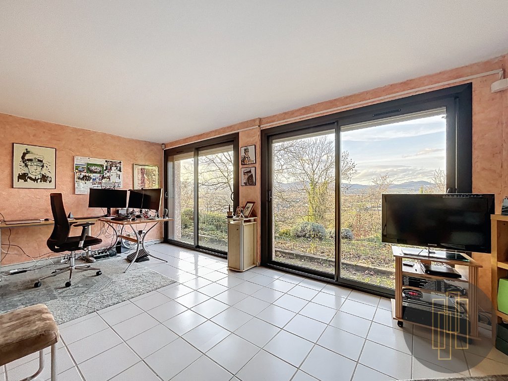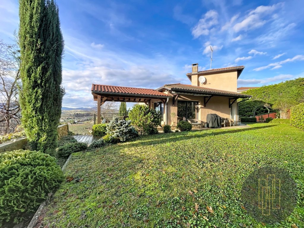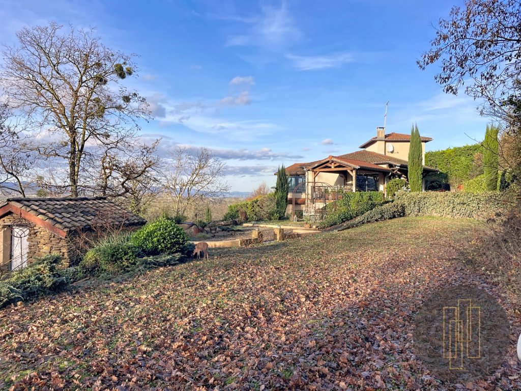 À l'extérieur, le terrain paysagé avec sa vue panoramique sur le beaujolais des pierres dorées offre un spectacle changeant au fil des saisons.