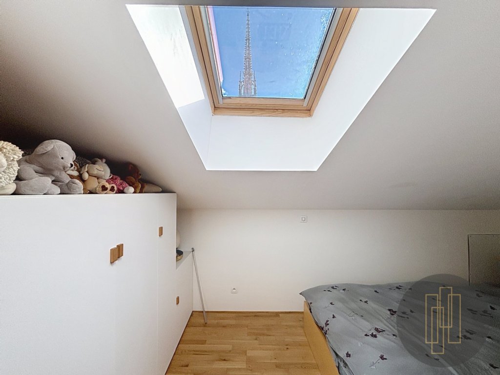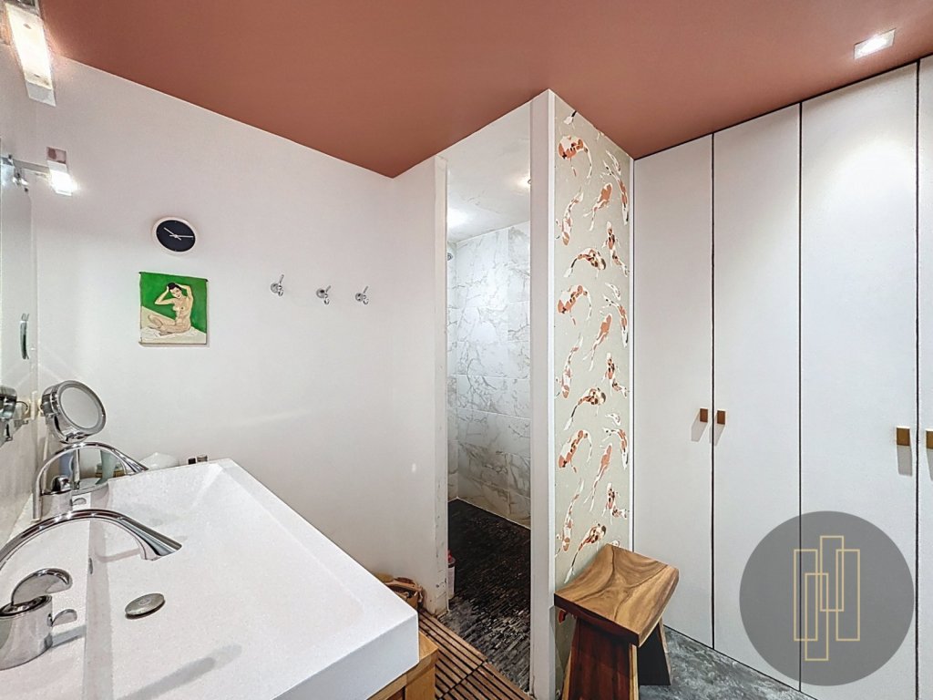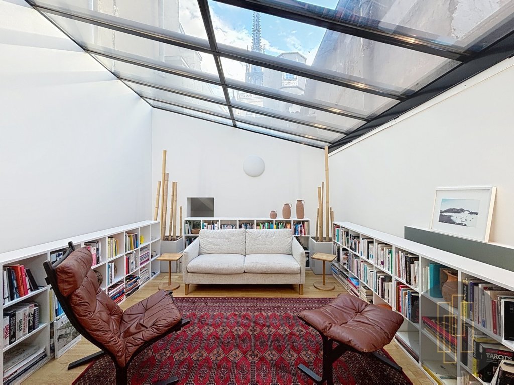 La rénovation, audacieuse et rare, surprend par ses lignes et ses choix : dalle suspendue, passerelle aérienne, escalier façonné sur mesure, verrière ouvrant sur la flèche de Notre-Dame-des-Marais, mobilier intégré.