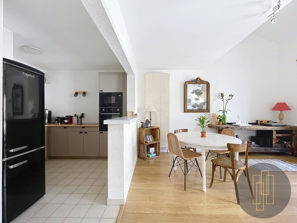 Dans Villefranche hypercentre, au dernier étage d'un immeuble sécurisé avec ascenseur, spacieux T3 de 90 m² (82.25 m² Carrez) comprenant au premier niveau, une pièce à vivre de 22.8 m² déplafonnée avec son coin cuisine de 8.45 m²; vue sur la Rue Nationale.