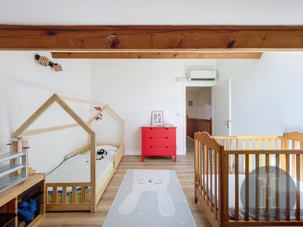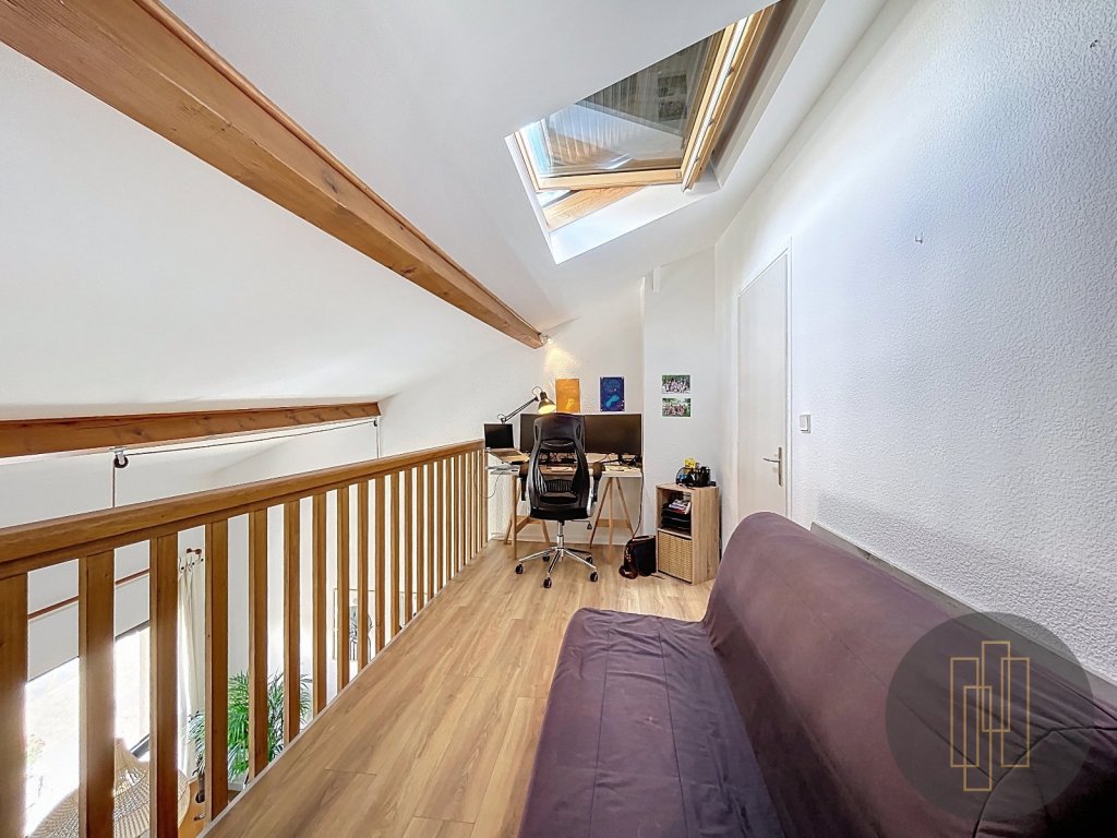 A l'étage, une chambre mansardée, une salle de bains, une belle mezzanine donnant sur le séjour et un dressing indépendant. Les volumes sont aérés, et la lumière agréable.