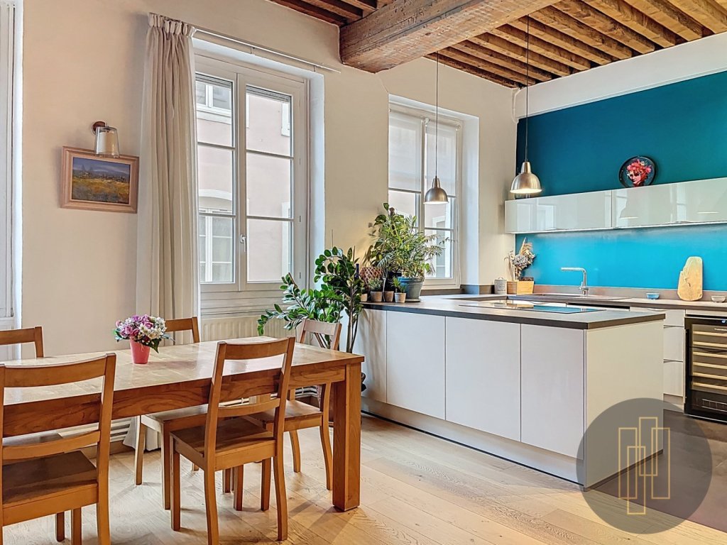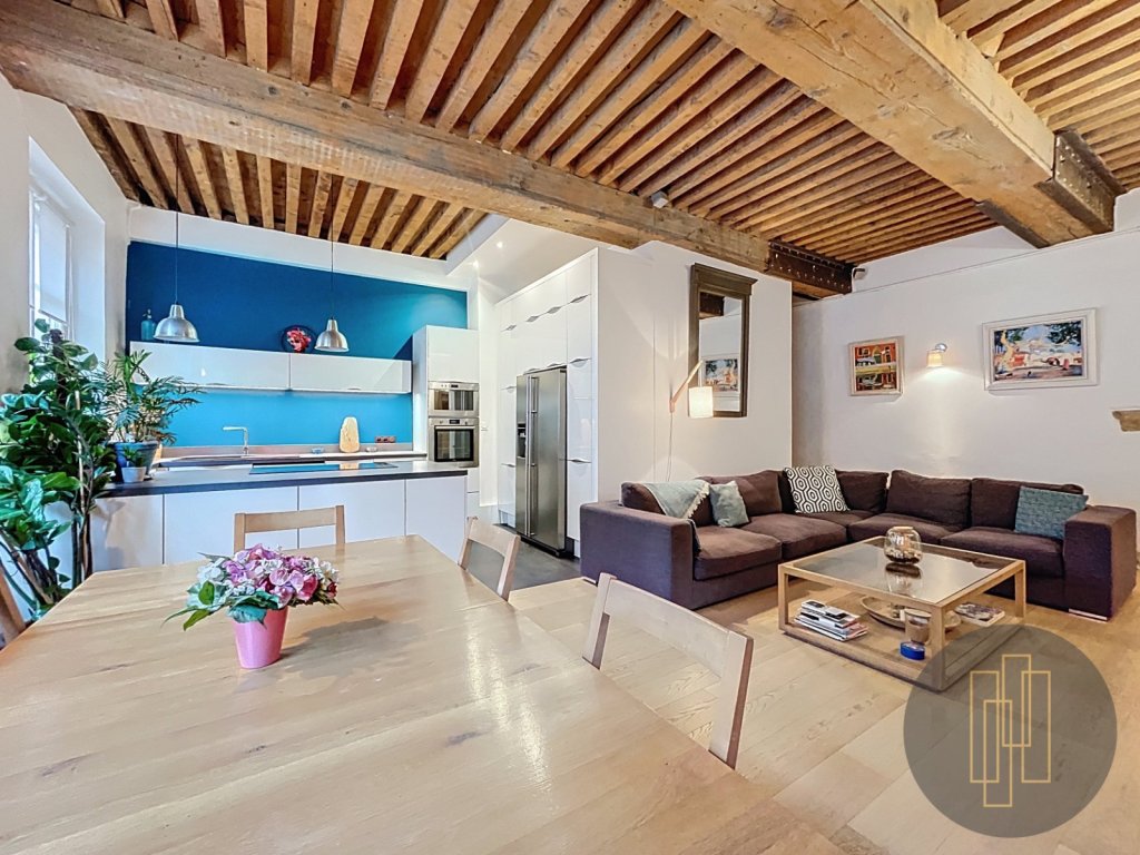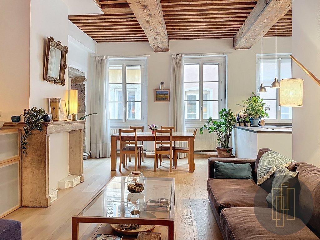 La pièce de vie, d'environ 45 m², s'organise autour d'un vaste espace réunissant salon, salle à manger et cuisine ouverte. La hauteur sous plafond supérieure, les poutres apparentes, le parquet ancien, la cheminée décorative et les murs en pierre confèrent à l'ensemble une identité forte, typiquement lyonnaise.